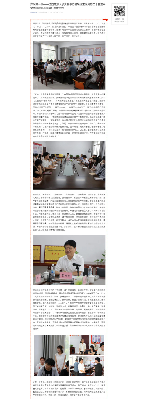9月13日,3522vip浦京集团官网党委书记贺瑞虎在西湖校区开讲“开学第一课”,以“对象化、分众化、互动式”的方式宣讲党的二十届三中全会精神和习近平总书记在全国教育大会上的重要讲话精神,教育引导青年学生坚定马克思主义信仰、中国特色社会主义信念、中华民族伟大复兴信心,立报国强国大志向、做挺膺担当奋斗者,努力成为适应新质生产力发展的大国工匠、能工巧匠、高技能人才。