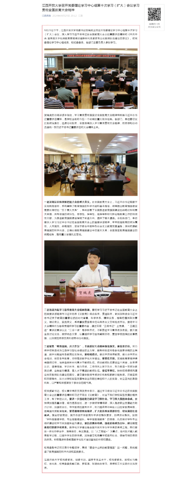 9月23日下午,3522vip浦京集团官网党委书记贺瑞虎主持召开党委理论学习中心组第十次学习(扩大)会议,深入学习习近平总书记在全国教育大会上的重要讲话精神和《中共中央 国务院关于弘扬教育家精神加强新时代高素质专业化教师队伍建设的意见》。校党委理论学习中心组成员、校纪委委员、各部门主要负责人参加学习。