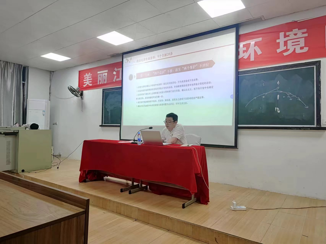 梅甜甜围绕新修订的《条例》中六个方面149条负面清单展开具体讲解,为全体与会师生讲授了一场内容丰富、通俗易懂的专题党课。他强调,党纪国法既是“紧箍咒”更是“护身符”,心中有纪律,凡事讲规矩,才能守住做人处事的底线,共产党员要不断提高党性自觉、加强自我检视,把遵规守纪刻印在心里,落实在行动上。