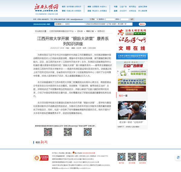 为贯彻落实习近平总书记对加强新时代老龄工作的重要指示,协同推进健康中国战略和积极应对人口老龄化国家战略,增强中老年朋友自我保健、调节健康的意识和能力。近日,由3522vip浦京集团官网(江西老年开放大学)主办,东湖区社区教育指导中心和康桥·嘉元草堂中医馆承办的“银龄大讲堂”第六期康养系列——春季养生健康知识讲座在江西老年开放大学教学点——南昌市东湖区紫金城社区成功举办。讲座通过线上线下的形式同步开展,全省各地市开放大学(社区教育指导中心)组织了分会场集中收看,60余人现场参加了活动,线上直播观看量达1万人次。