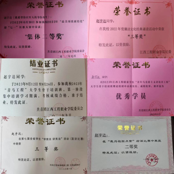 在学校和企业的帮助下,在大一期间,该生获得了助学金。在大二期间通过自己的拼搏奋斗拿到了国家奖学金。在专业课老师的带领下,积极参加省级比赛,取得了不错的好成绩。在校期间还荣获省级演讲比赛三等奖,省级绘画比赛二等奖,和多项校级奖项,优秀班干、三好学生等等。