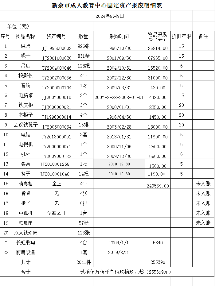 经新余市成人教育中心第七次党委会研究决定,现有一批旧课桌、凳子、厨房设备、铁床等物品共计2041件,底价为33953元进行公开拍卖,详见新余市成人教育中心固定资产报废明细表。