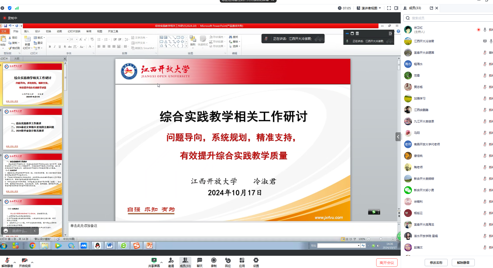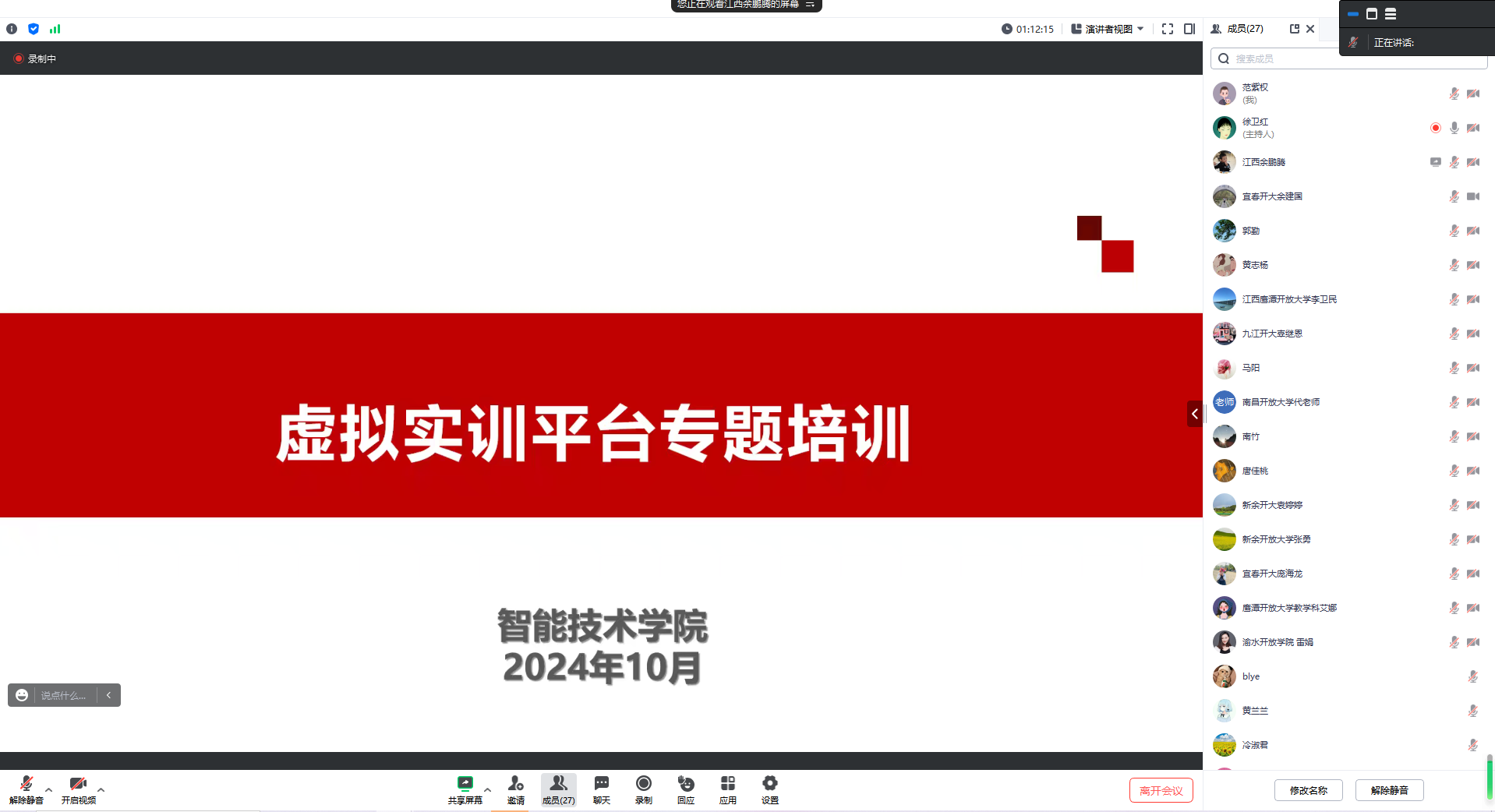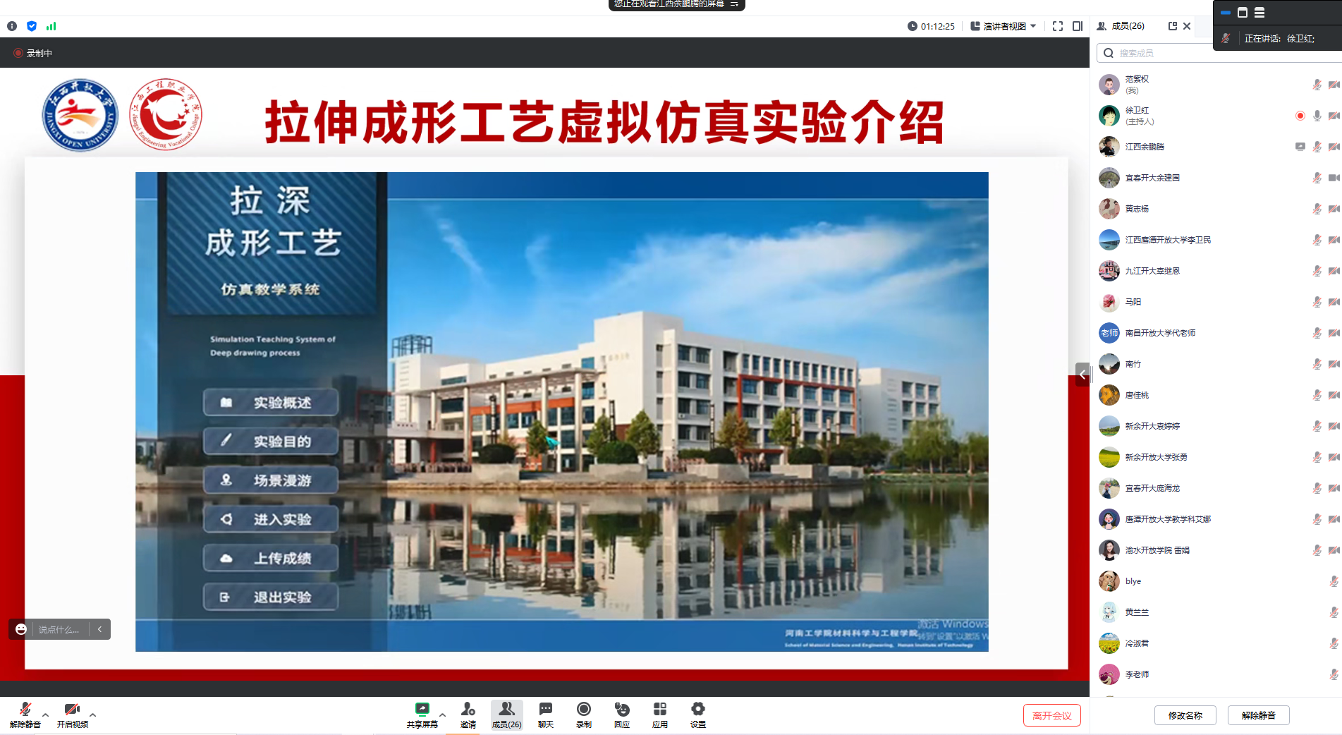 余鹏腾老师从实验概述、实验目的、场景漫游、进入实验、上传成绩等方面对虚拟实训平台进行了专题培训。