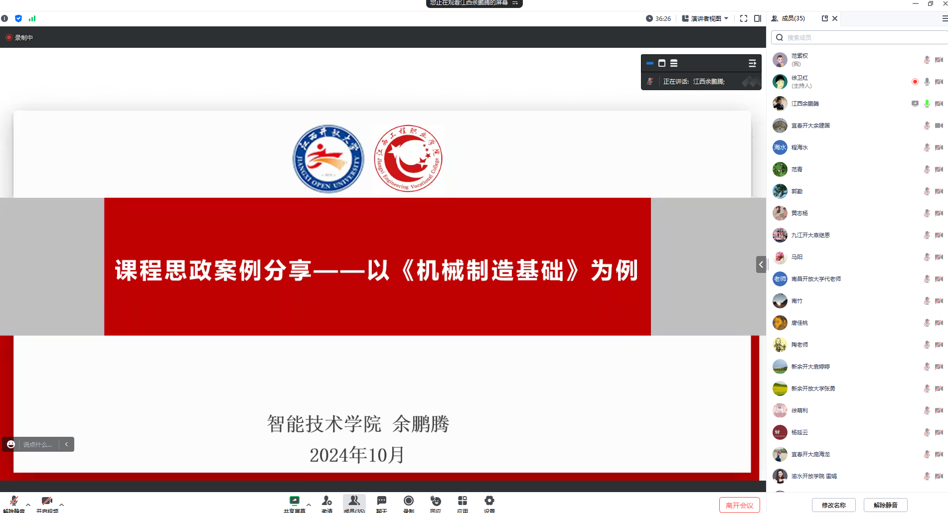 余鹏腾老师以《机械制造基础》课程思政案例为例,从课程思政的个人理解、课程思政大纲设计、课程思政教学设计案例等3个方面对课程思政建设做了精彩展示。