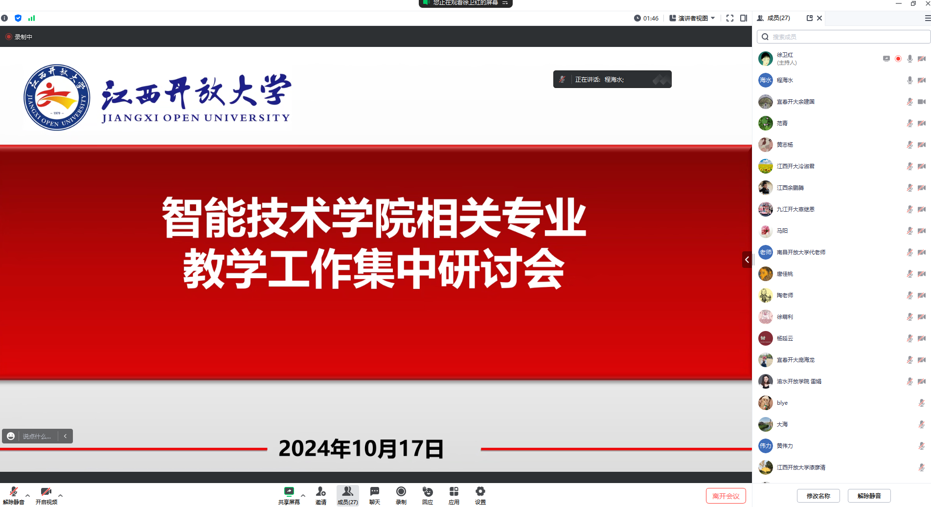 10月17日下午,智能技术学院召开学历继续教育专业教学工作集中研讨会,学院党委副书记、院长程海水,全省开放大学系统(含市级、县级)有关课程责任教师、论文指导教师、答辩教师及综合实践环节工作的负责人,智能技术学院专任教师、相关专业负责人,课程网络教学团队成员共计40余人参会,会议由学院教务科长徐卫红主持。